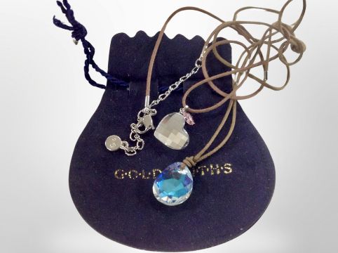 A Swarovski crystal heart and butterfly pendant on leather cord, together with one other similar.
