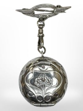 An Art Nouveau silver pill box suspended on bar brooch, height 6.5cm