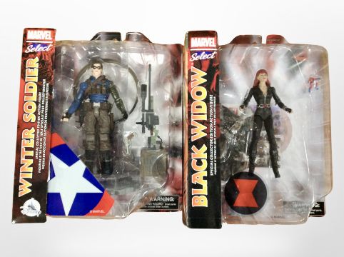 Two Diamond Toys Marvel figurines, The Winter Soldier and Black Widow, both boxed.
