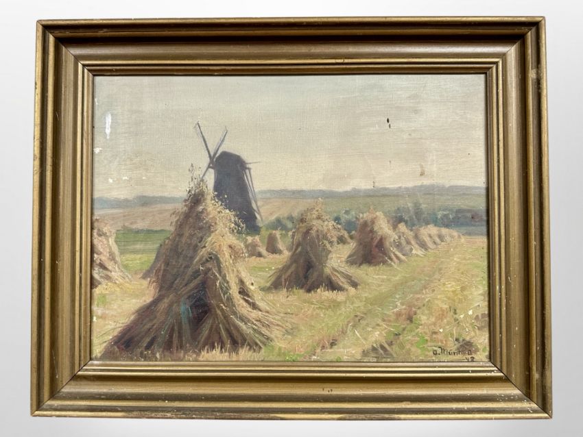 Danish school : Haystacks in a field, oil on canvas, 43cm x 31cm