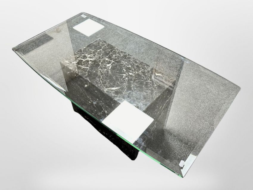 A Barker and Stonehouse glass coffee table on marble pedestal support, 110 cm long x 60 cm wide x 48 cm high