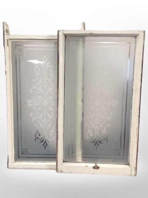 Two antique etched windows in painted frames, 104cm x 59cm.