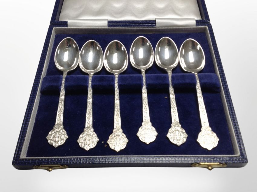 A cased set of six Lindisfarne silver teaspoons, retailed by Reids of Newcastle.