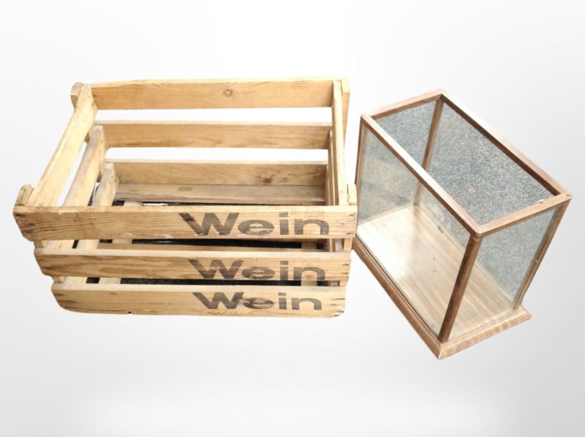 An electric radiator, laminator, two pine crates, metal filing box, glazed teak display box etc