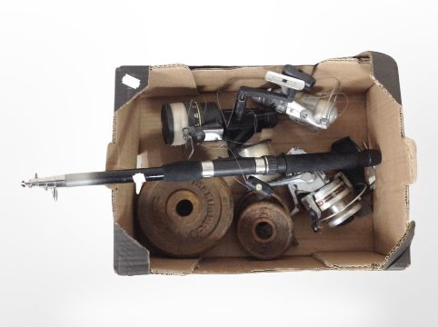 A Derco collapsible fishing rod, with reel, two further reels, spool of fishing line, four dumb bell weights
