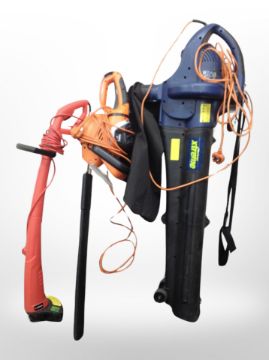 A Sovereign electric garden strimmer, Von Haus hedge trimmer and a Challenge leaf blower