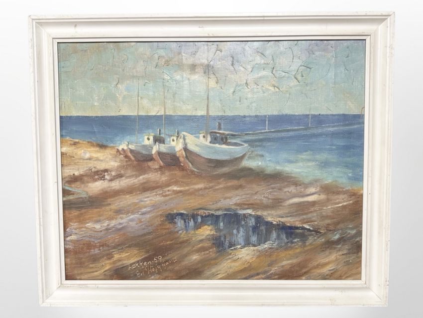 E Holgaard : Fishing boats at low tide, oil on canvas, 48cm x 38cm.