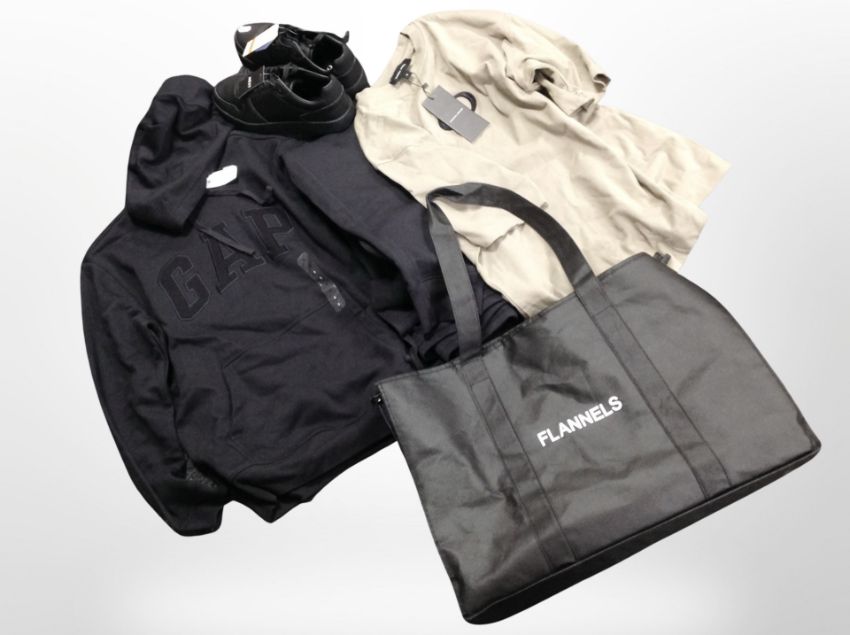 A Criminal Damage shirt, size small, GAP hoodie, small and tracksuit bottoms, pair of Next shoes size 7 and a Flannels bag