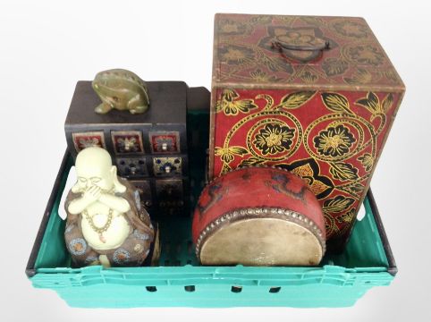 Two Oriental storage boxes, painted circular drum and a resin figure of Buddha