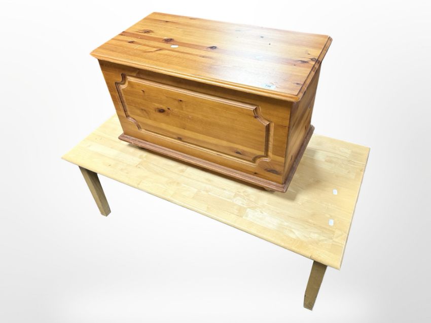 A contemporary rectangular coffee table and a pine blanket box