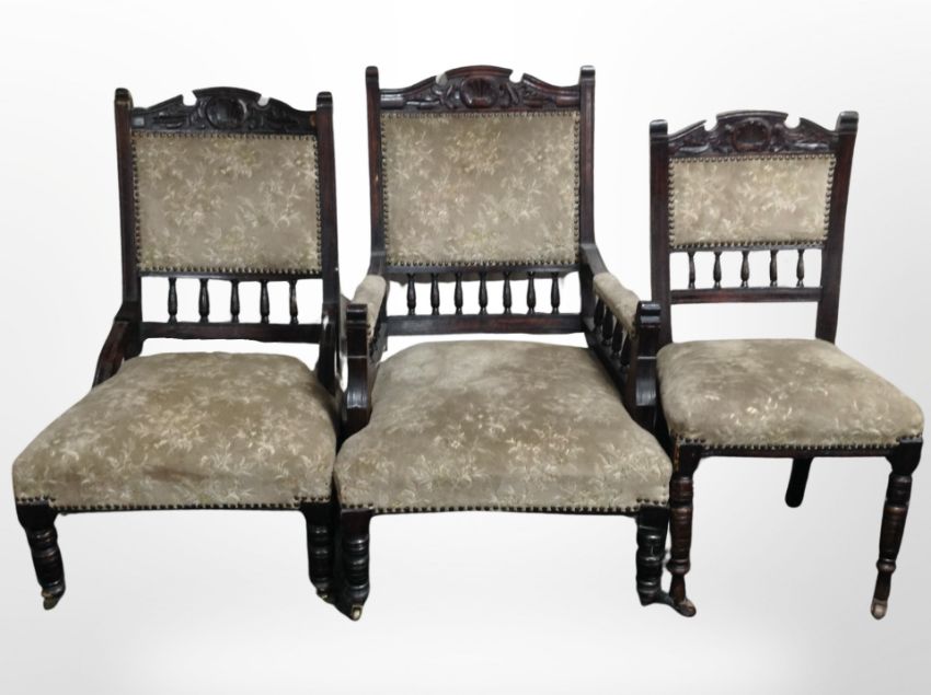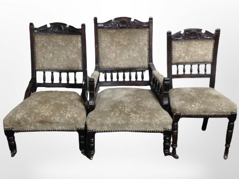 A group of four matching Victorian carved mahogany salon chairs