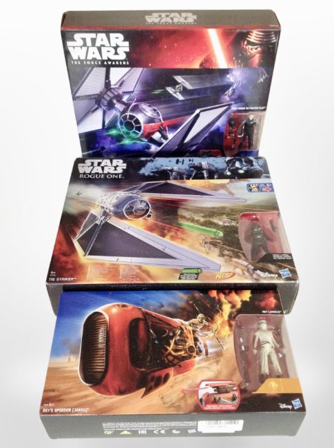 Three Hasbro Star Wars models, Tie Striker, Tie Fighter, and Rey's Speeder (Jakku).