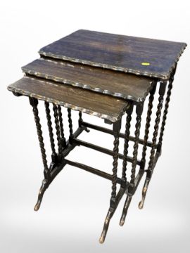 A nest of three barley twist oak tables, width 50 cm