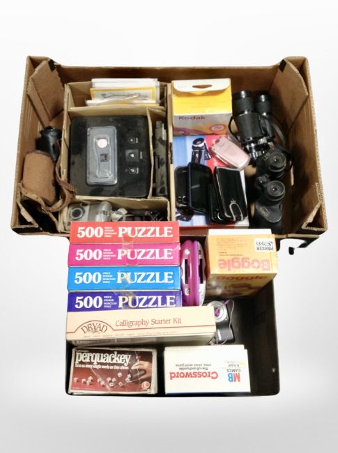 Two boxes containing binoculars, mobile phones, cameras, puzzles and games.