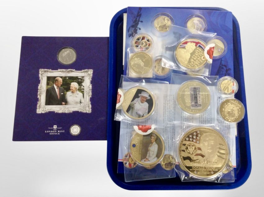 A collection of gold-plated commemorative coins including royalty, the Royal Air Force, etc.