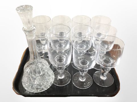 A set of 11 Scandinavian crystal drinking glasses and a mallet-shaped decanter.