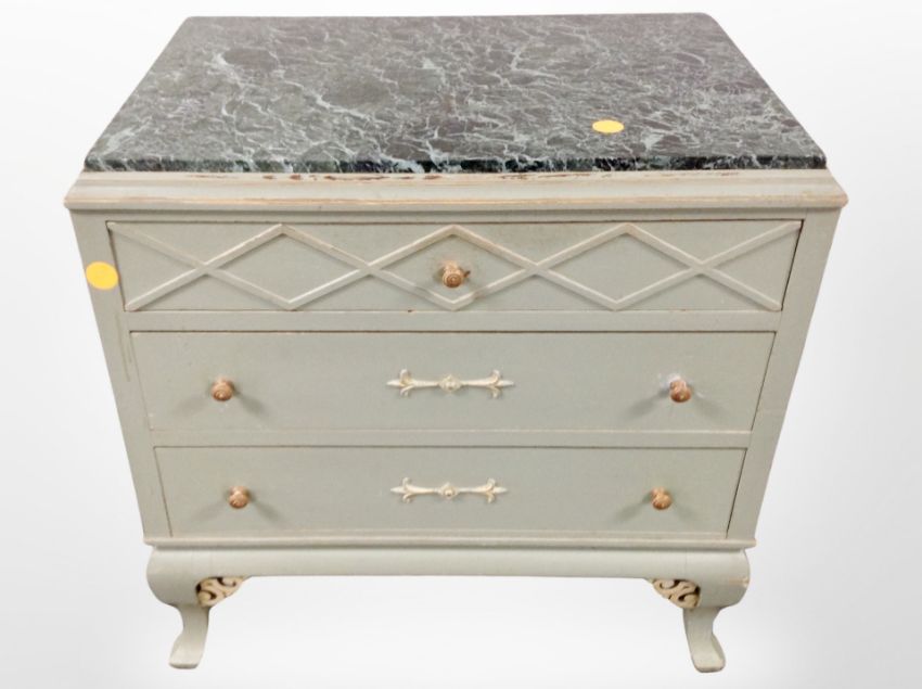 A 19th century Scandinavian painted pine three drawer chest with green marble inset top, 74 cm wide x 49 cm deep x 74 cm high
