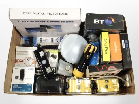A box containing home electricals including digital photo frame, underwater cameras, MP3 player, video camera, etc.