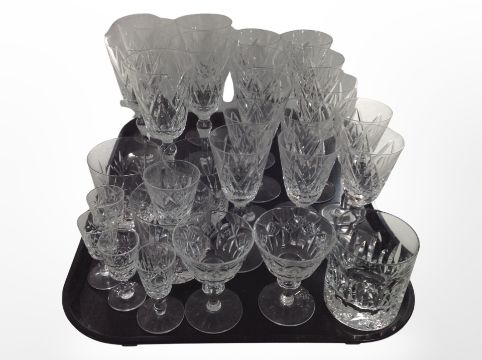 A group of crystal drinking glasses.