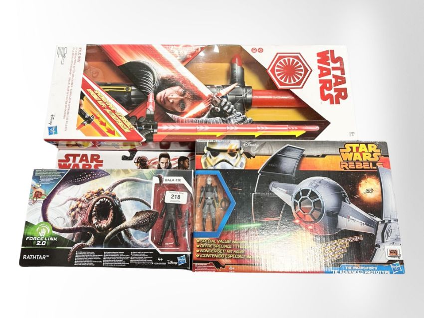 A Hasbro Star Wars Kylo Ren's Spring-Action Lightsaber, together with a The Inquisitor's Tie Advanced Prototype model, and a Rathtar, all boxed.