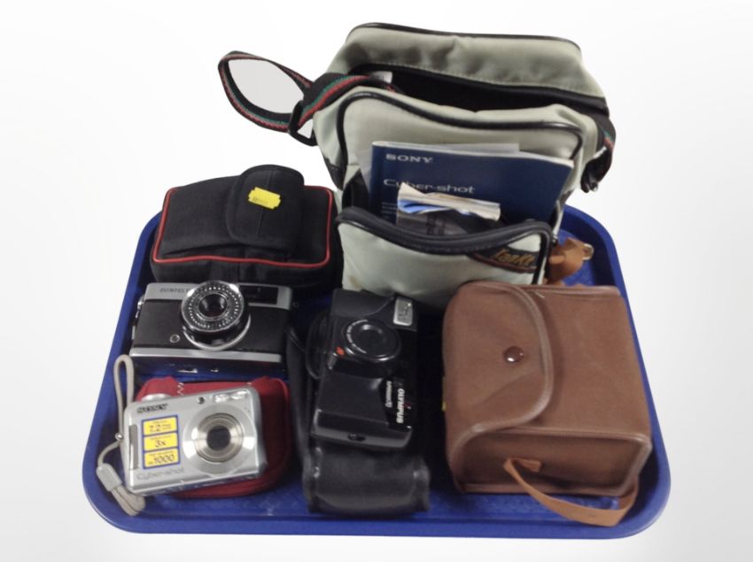 A group of cameras including Olympus Trip 35, Sony Cyber-shot digital camera, Brownie Six-20 camera.