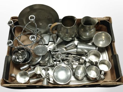 A box of stainless steel and pewter wares including mugs, candle holders, jugs, etc.