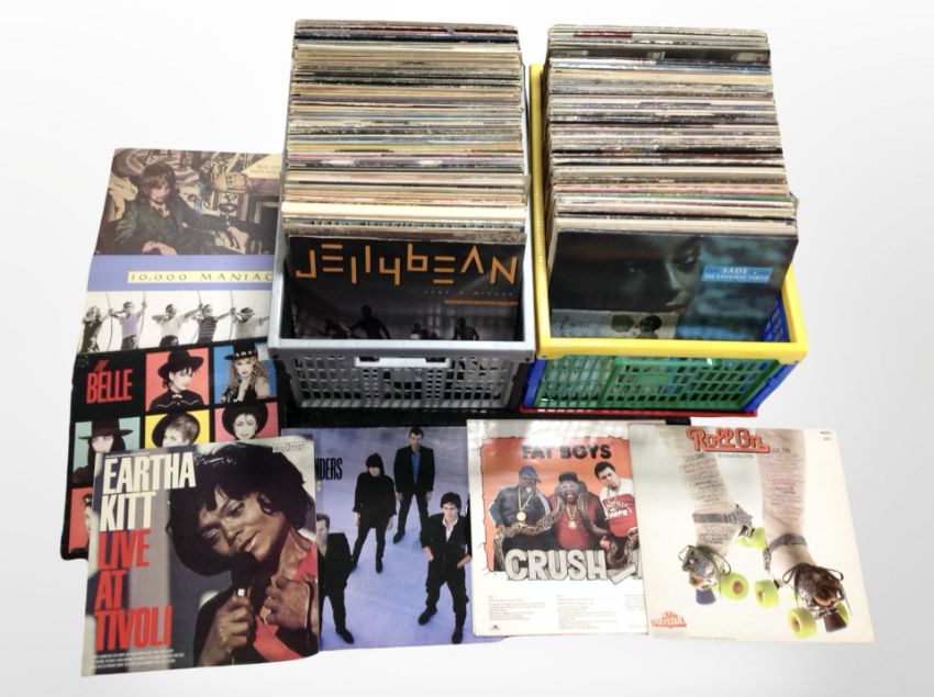 Two crates of vinyl LP records including Rod Stewart, Whitney Houston, Ultravox, Eurythmics, Carlos Santana, Deep Purple, Eagles, and other mixed artists.