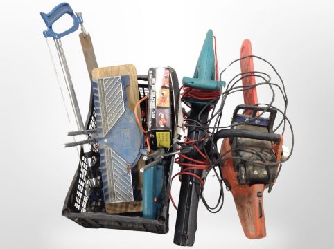 A crate containing hand tools, soldering gun, Black & Decker jigsaw, together with a Bosch electric hedge trimmer and a Dolmar electric chainsaw.