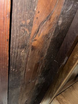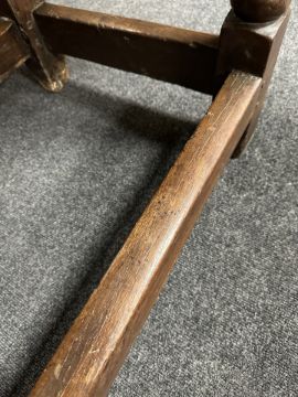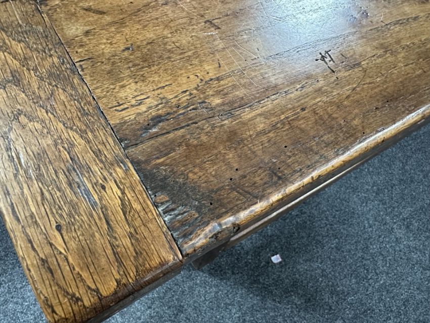 Historic woodworm throughout. Natural split to centre of top, again revealing worm to interior of plank. Other smaller natural splits throughout. Timber generally with good patina. Ring mark to top. Examination of underside also reveals much old worm damage. There is a fair bit of movement in the frame. See images.