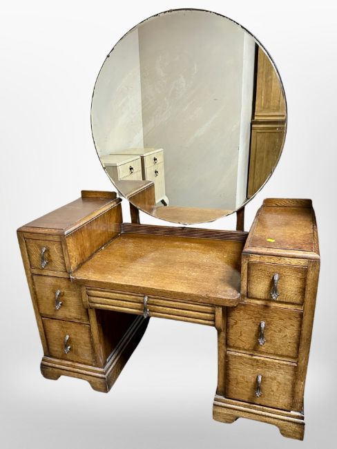 A 1930s oak mirror-back sunk-centre dressing table, 108cm wide x 49cm deep x 145cm high.