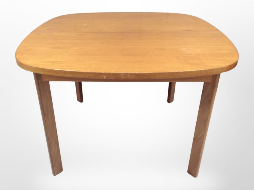 A G-Plan teak extending dining table with leaf, length 112cm (unextended), together with a set of four G-Plan teak dining chairs with X-shaped understretchers.