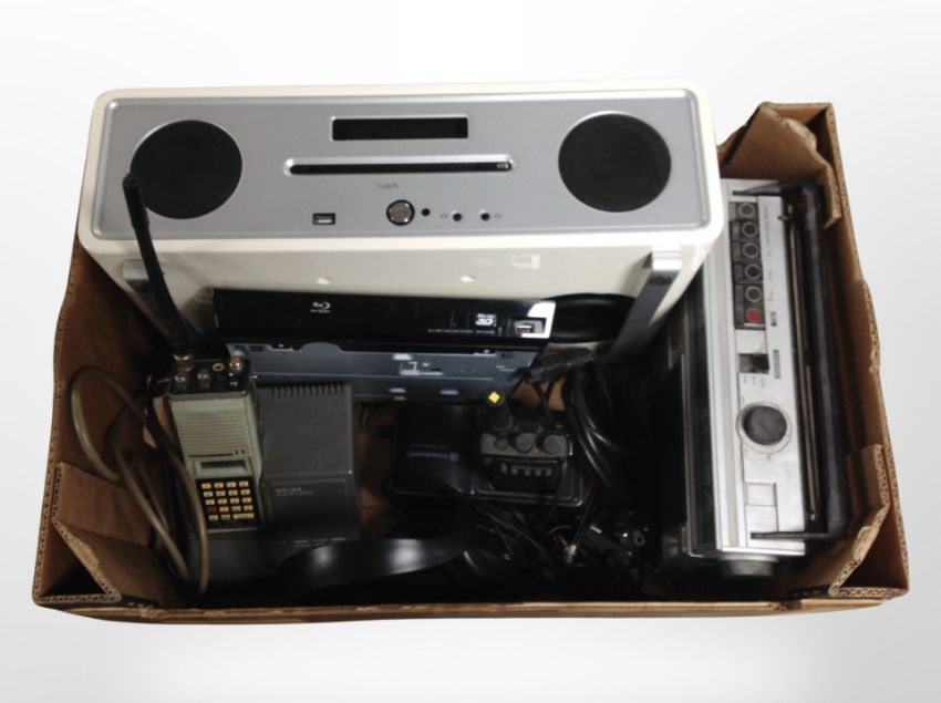 A box containing Ruark radio, a further radio, walkie-talkies, headphones, Blu-Ray disc player, etc. (continental plugs).