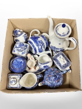 A box of Ringtons blue and white ornaments including tea china, chintz items, caddies.