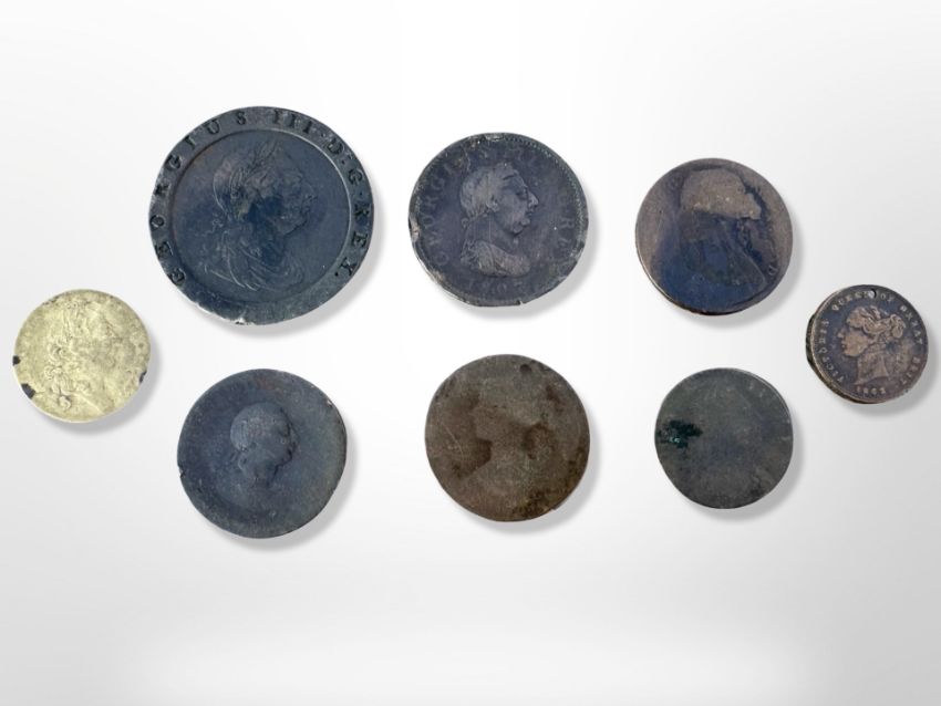A George III cartwheel tuppence 1797, fine, and several other coins