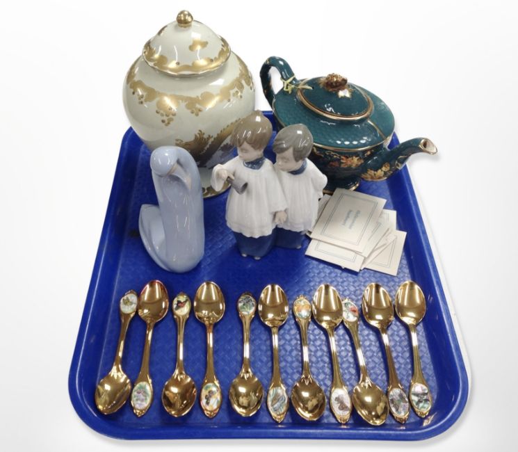 A Coalport Kingsware gilded lidded vase depicting a dragon, Wade teapot, Lladro and Nao figures and a group of gilt teaspoons