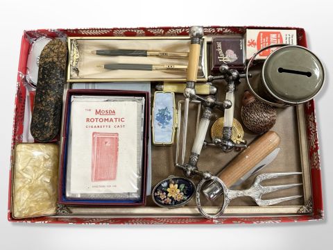 A group of collectables including Mosda Rotomatic cigarette case, pocket knife, Paper Mate pen and pencil, pair of mother of pearl and EPNS knife rests etc