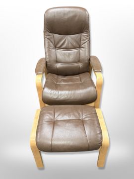 A Scandinavian bentwood and brown stitched leather armchair with matching footstool