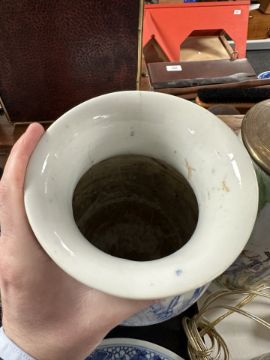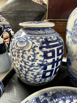 Lidded jar with hairline cracks visible to base. Vase with hairline crack to rim. Other pieces seem to be in good order.