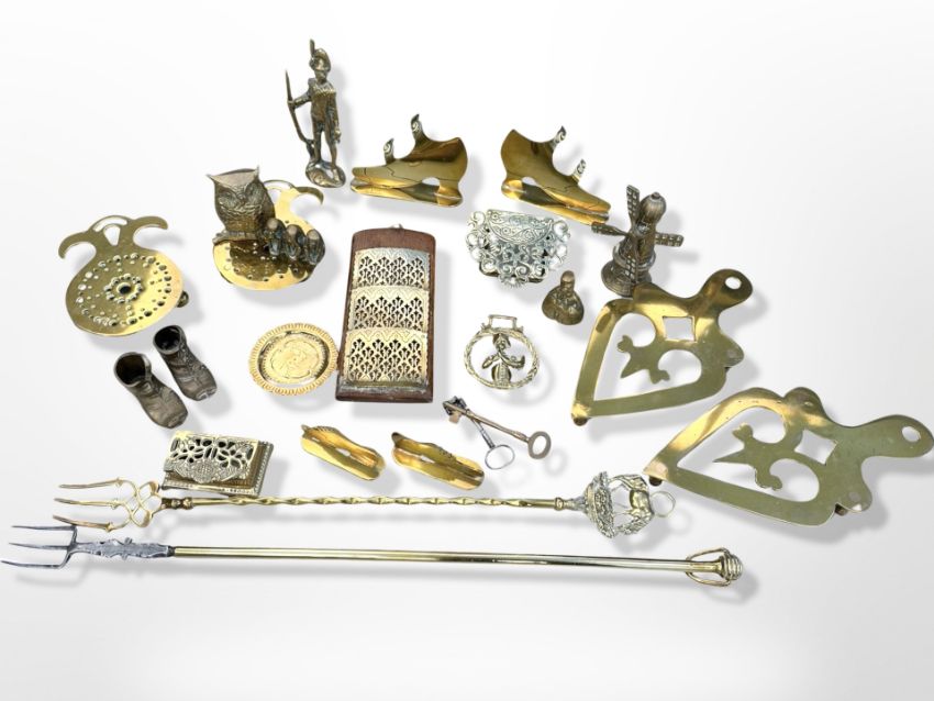 A collection of brass wares, trivets, toasting forks, small trinket box, correspondence rack etc