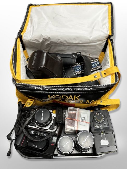 A Kodak camera bag containing assorted cameras and lenses, Olympus OM-1 camera, Minolta AF-DL camera etc