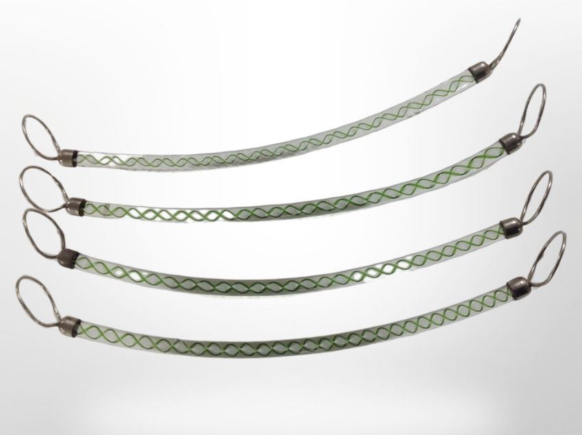 A set of four glass twist-stem napkin holders with silver-plated mounts, each 23cm long.