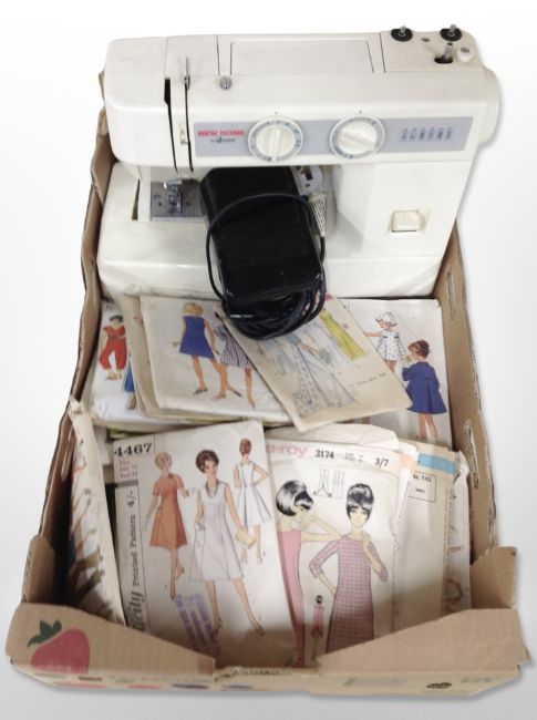 A Newhome electric sewing machine with lead and pedal, sewing patterns etc