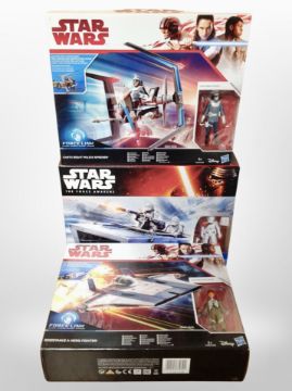 Three Hasbro Star Wars models, Resistance A-Wing Fighter, First Order Snowspeeder, and Canto Bight Police Speeder.