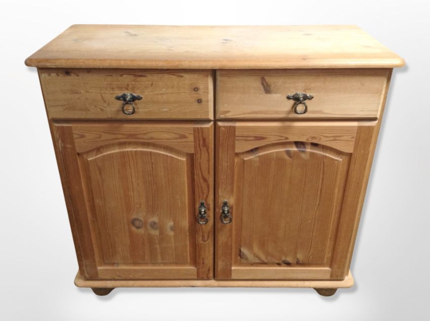 A contemporary pine double door side cabinet, 91 cm x 39 cm x 82 cm