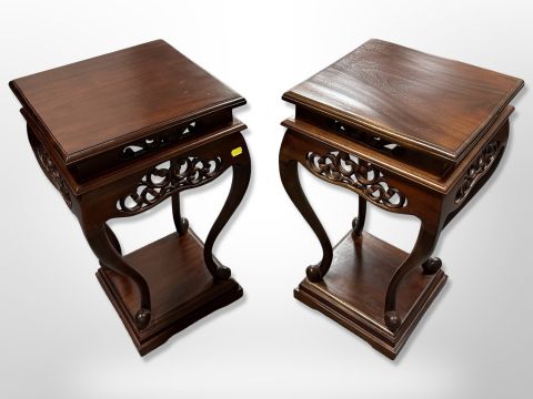 A pair of reproduction mahogany oriental style plant stands, 35cm square x 61 cm high