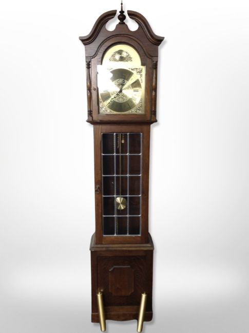 A reproduction Tempus Fugit longcase clock with pendulum and weights, height 198 cm