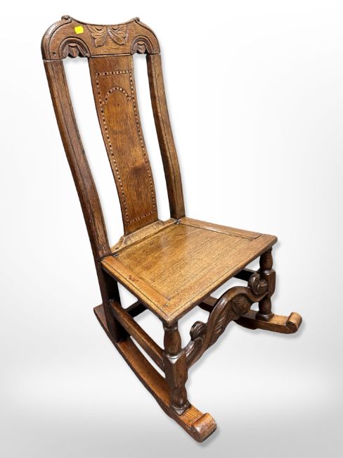 An early 20th century inlaid oak rocking chair, width 52 cm