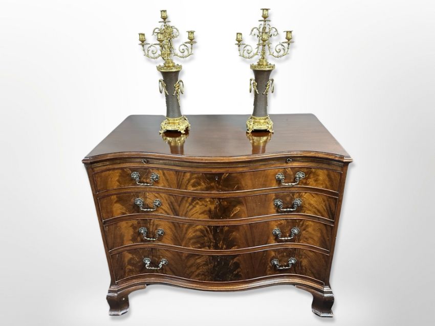 A fine quality mahogany serpentine fronted chest of four drawers by Howard & Sons Ltd, 25, 26, and 27 Berners Street, London, in the George III style, with ornate cast-brass bow handles and brushing slide beneath the highly-polished top, raised on canted serpentine bracket feet, 110 cm wide x 63 cm deep x 87 cm high, with plate glass top.