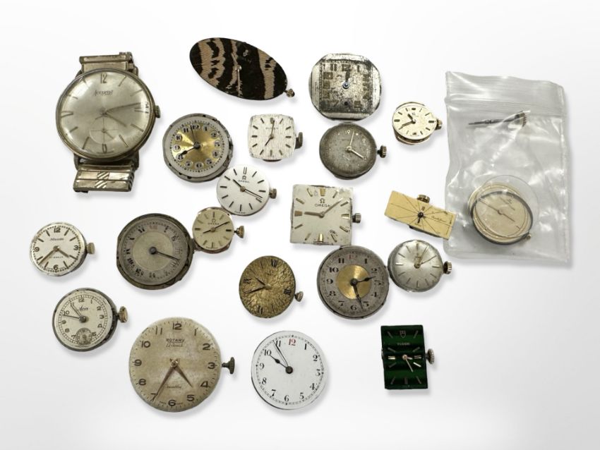 A collection of watch movements including Omega, Jaeger Le Coultre, Tudor etc.