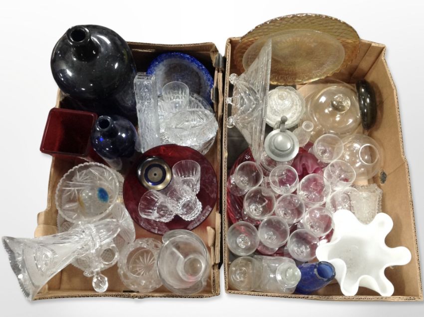 Assorted 20th-century continental glass wares including blue glass bottles, crystal vases, drinking glasses, paperweight, etc. (2 boxes)
